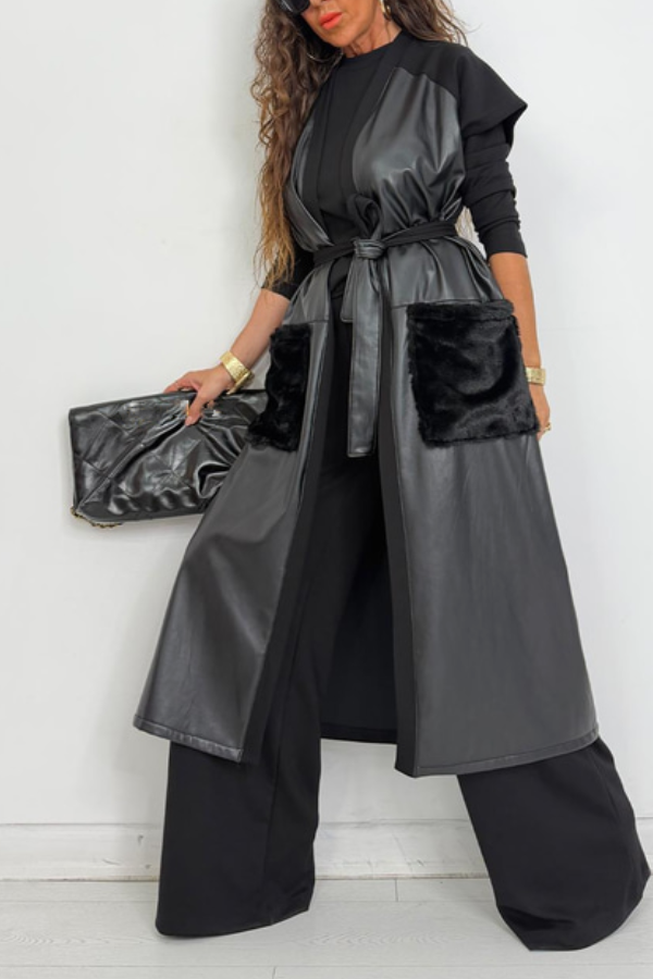 Get the ultimate chic look with our Black Faux Leather sleeveless Trench Gilet! in asoft, faux leather with silver stud details and belted waist, this edgy take on a classic trench style will give you a boldfearless look!