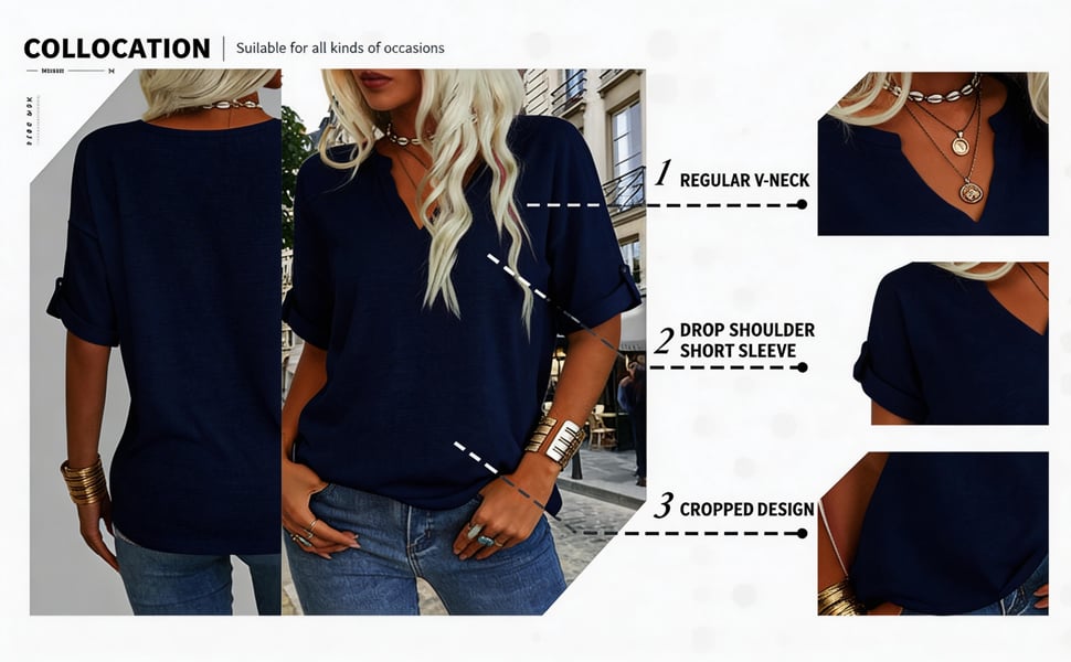 V-NECK CUT: A clean V-neck accentuates the collarbone and elongates the neck, giving a polished and graceful appearance. This timeless detail brings a hint of sophistication while maintaining a laid-back, versatile style suitable for multiple occasions.