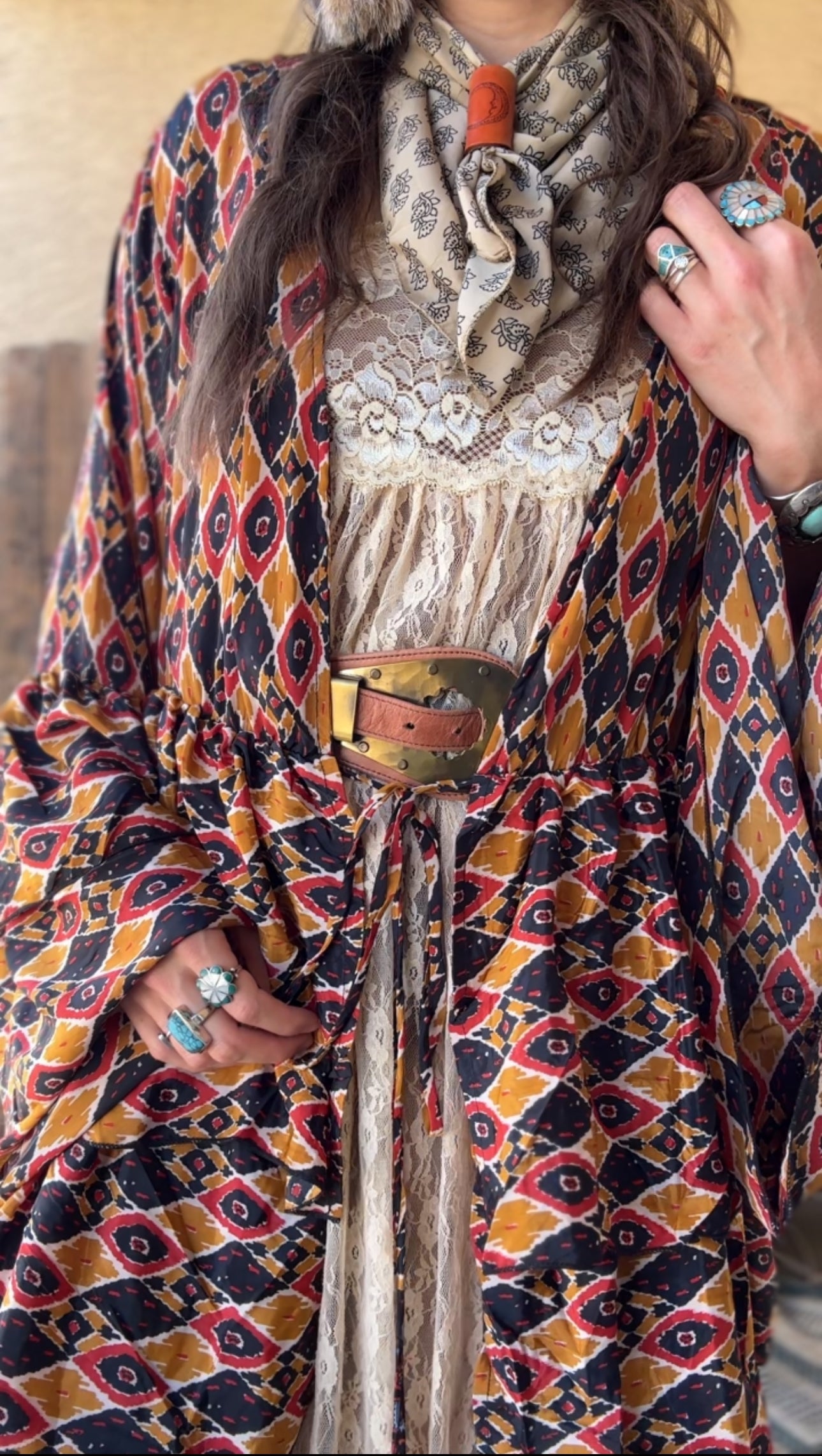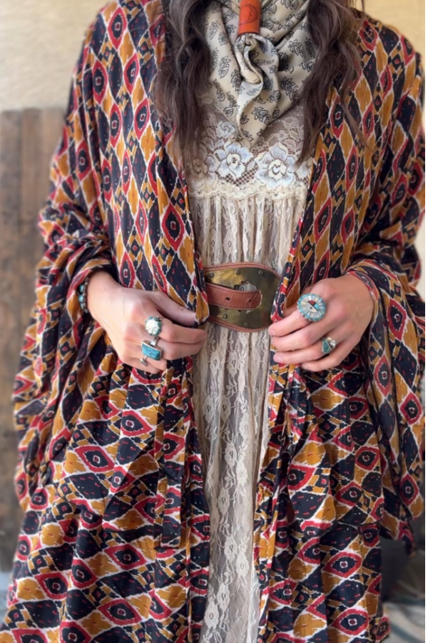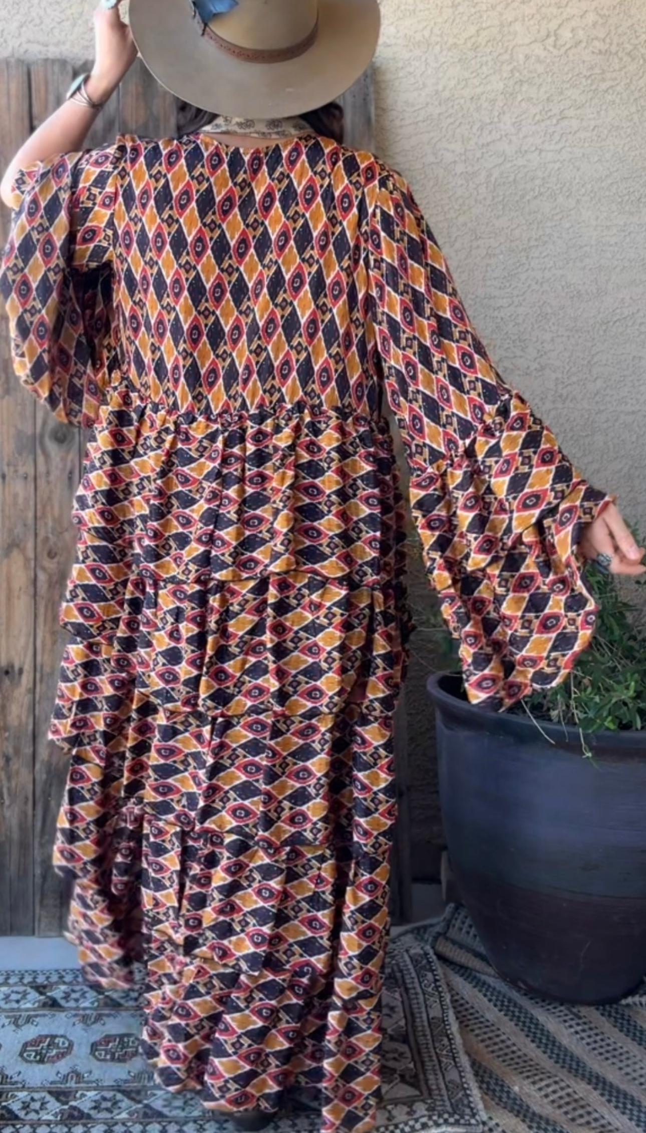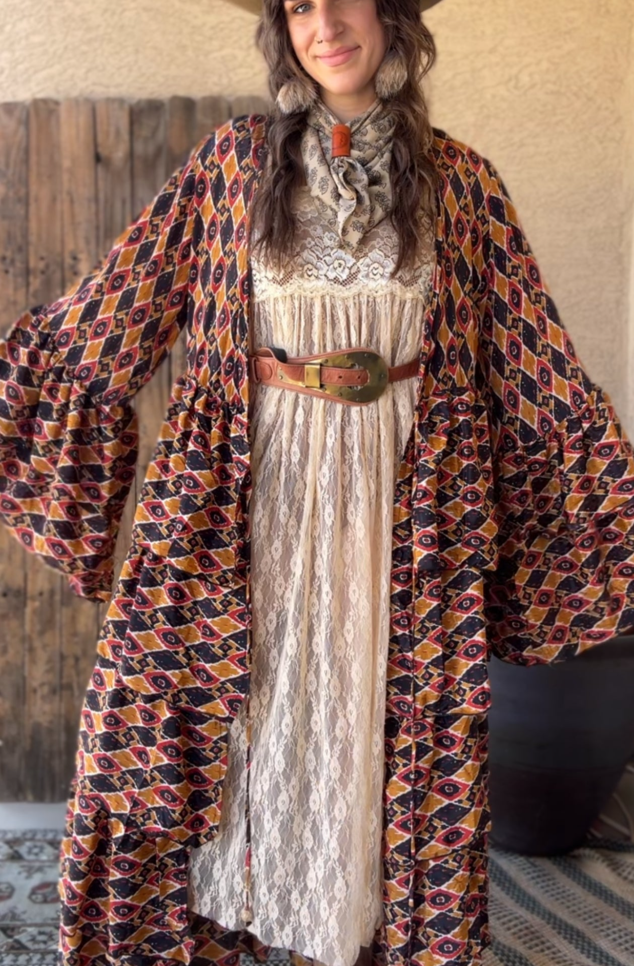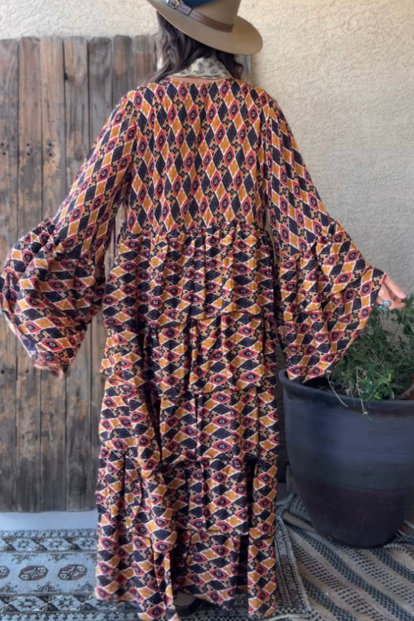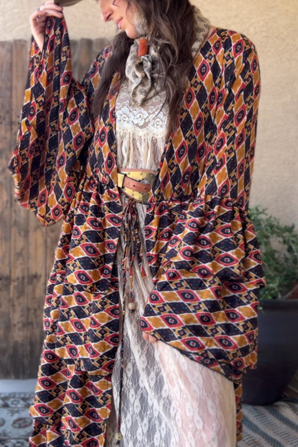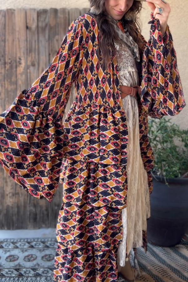 A perfect fusion of Western retro style and bohemian freedom, the red, brown, and black geometric print exudes a rich vintage feel. The loose silhouette is flattering to all body shapes, creating a laid-back, effortless feel for comfort and freedom from restraint. The extra-long design elongates the figure and can be worn under skirts or pants, making it versatile and versatile, combining fashion and practicality.