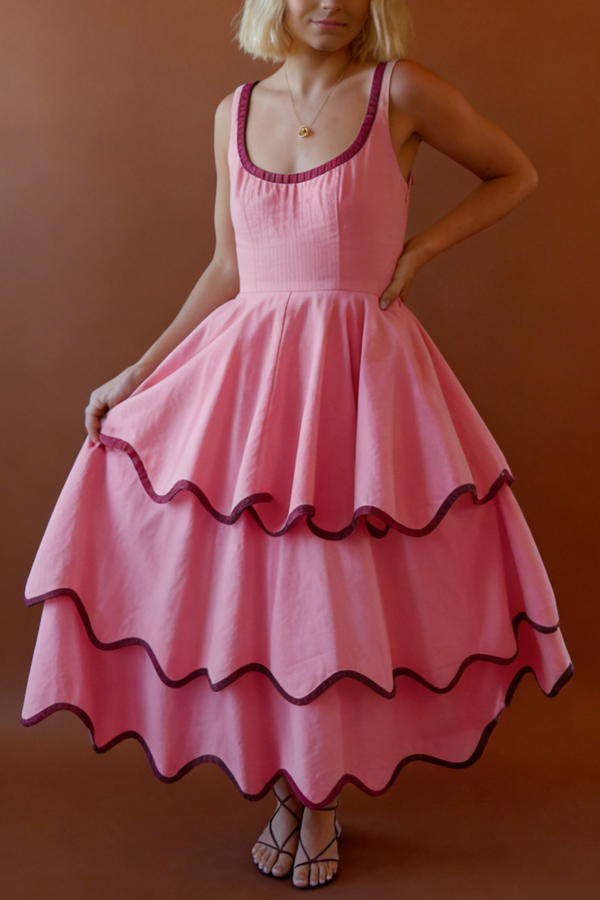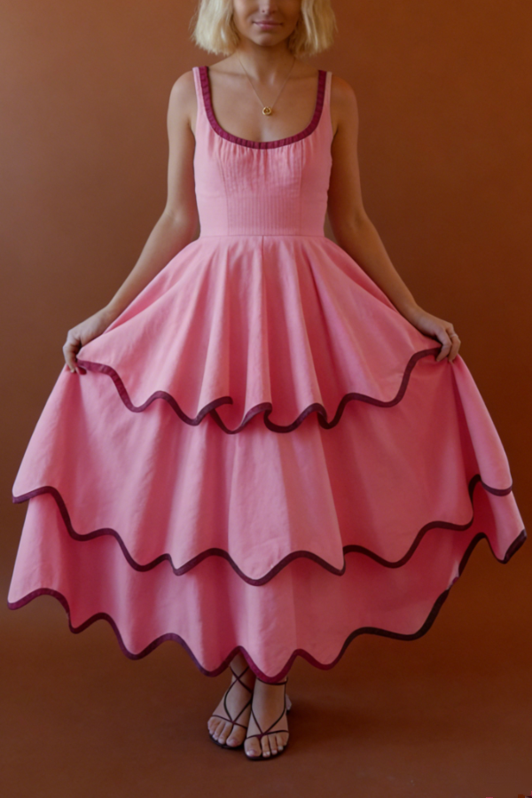 Featuring a three-tiered skirt with a circular cut, the dress boasts a full and voluminous silhouette that flows beautifully when twirling. The multi-layered, voluminous skirt creates an airy feel when moving, preserving the elegance of vintage dresses while adding a touch of sexiness with its open-back design. Each layer of the skirt is finished with a dark green trim, showcasing exquisite handcrafted details and elevating it beyond the ordinary long dress. The fabric drapes well and is wrinkle-resistant, ensuring both comfort for everyday wear and a sophisticated look for going out. The fitted bodice is lined, and the drawstring round neckline is adjustable for a comfortable and secure fit. Exquisite contrasting stitching highlights the delicate details of the princess-seam bodice, while invisible side pockets and a hidden zipper combine simplicity with practicality.