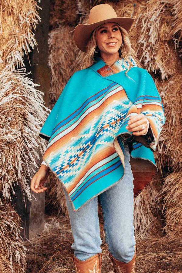 this poncho highlights the Pagosa design representing hot blue springs where Southern California Utes were known to bathe, rising through fire to bring health and peace. Pull this easy poncho over your head and you’re ready to go. Sleeveless and roomy for an easy-to-wear style. Open, breathable style with enough warmth to keep the chill away.