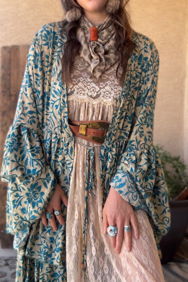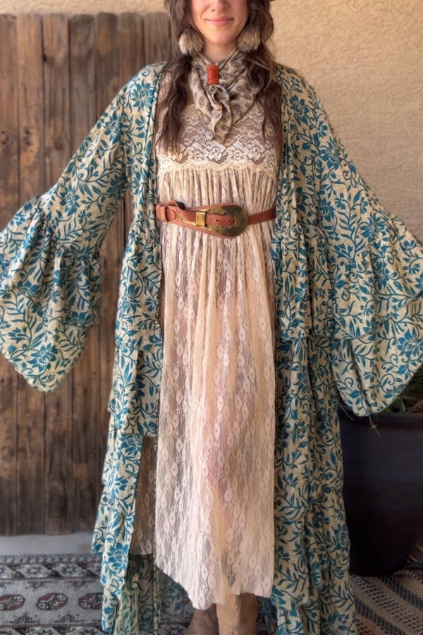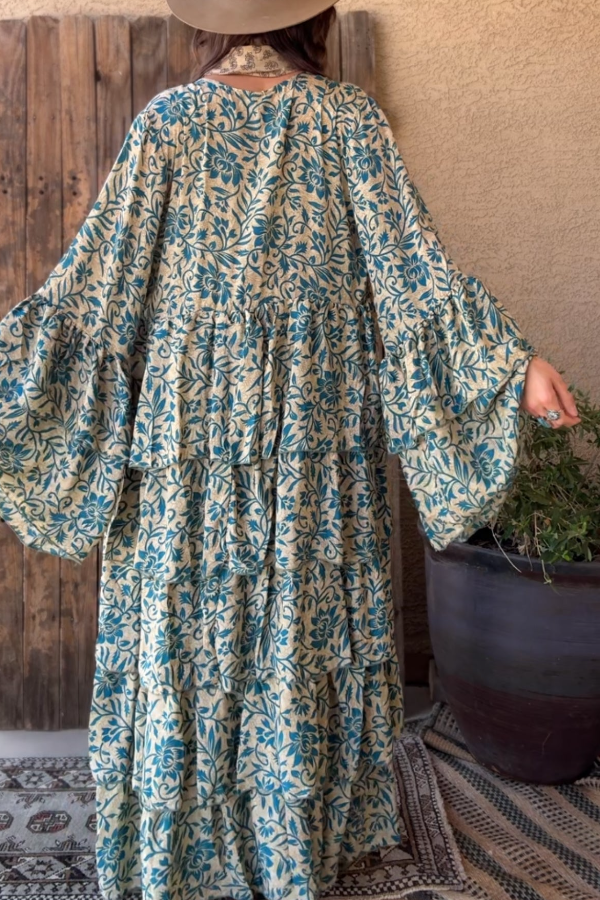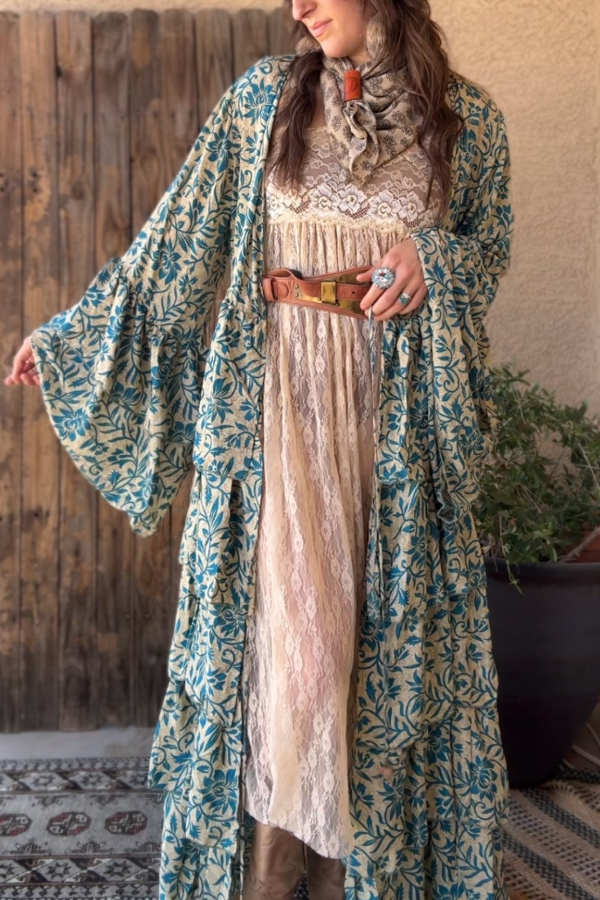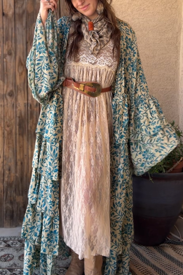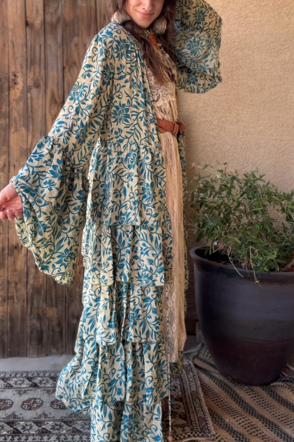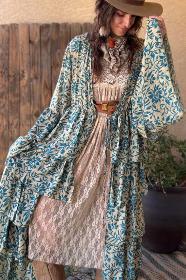 A clever fusion of Bohemian romance and Western retro style, the blue and white floral print exudes a free and unrestrained bohemian vibe. The loose silhouette is flattering to all body types, creating a relaxed, effortless vibe while maintaining a comfortable fit. The extra-long design visually elongates the figure, complementing both skirts and pants while providing warmth.