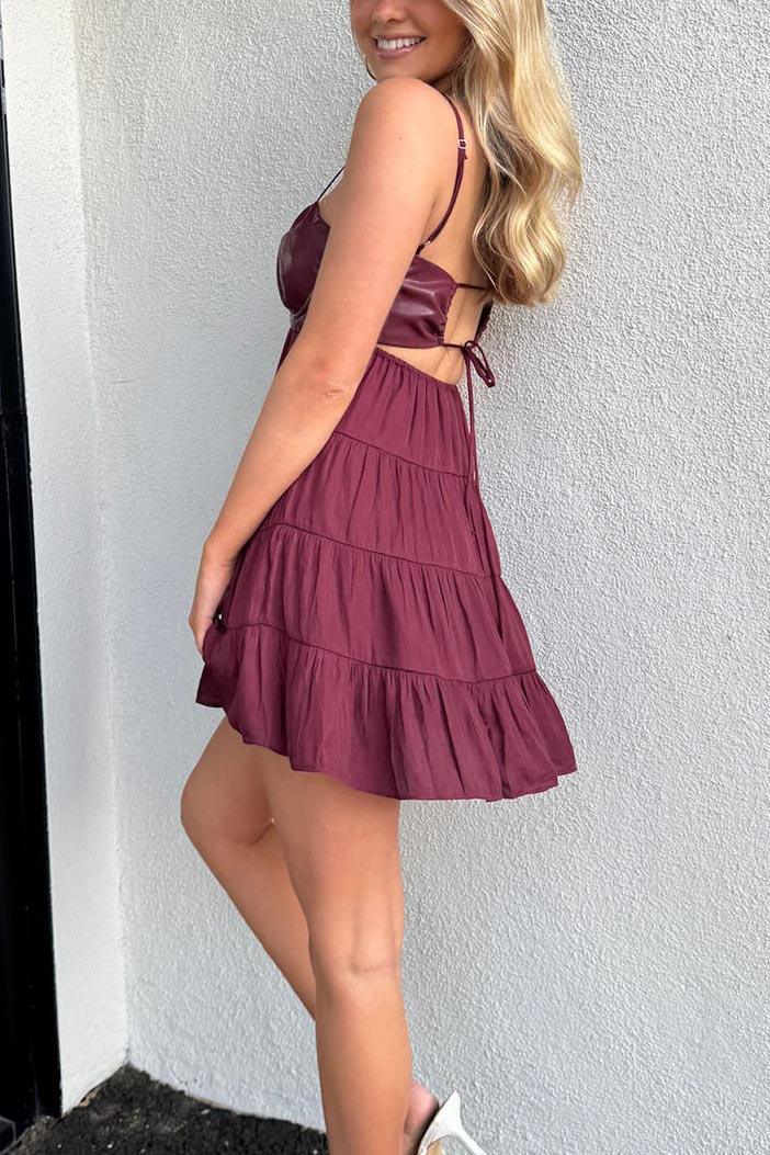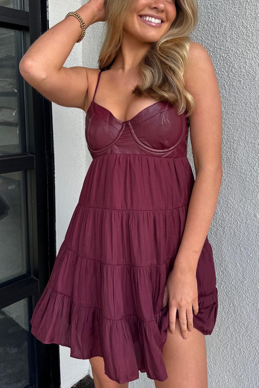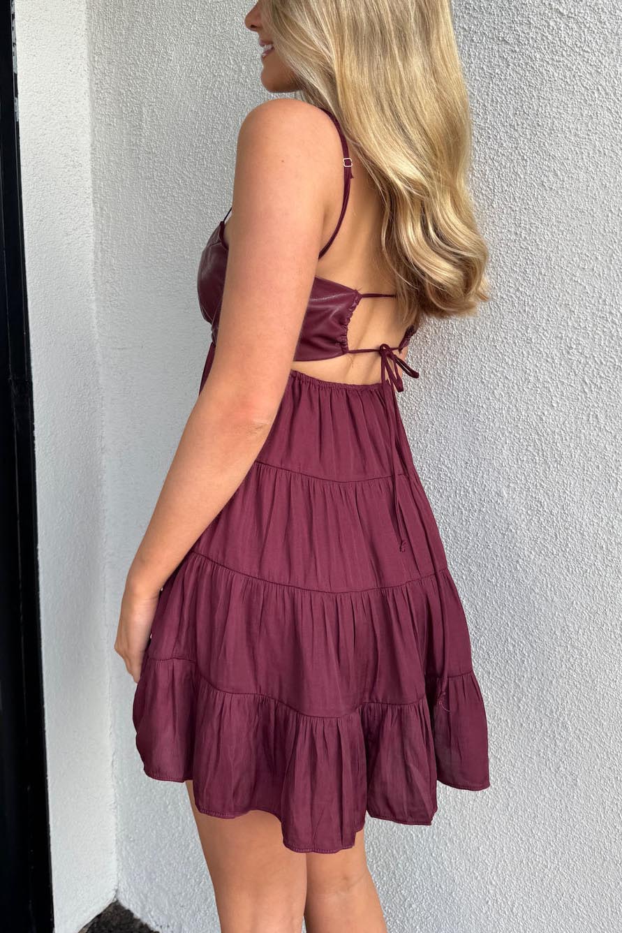 The "See You In The Summer Mini Dress" is the perfect dress for all upcoming festivities! The leather detailing, and flowy bottom make for the best simple dress! Pair this dress with gold chunky jewelry, platform heels, and wear it for your next dinner party, or date night!