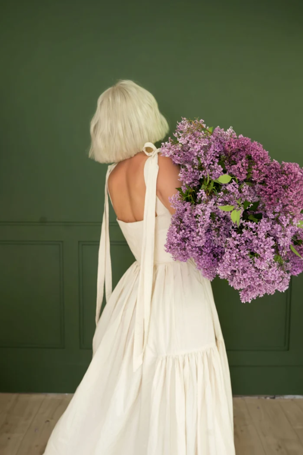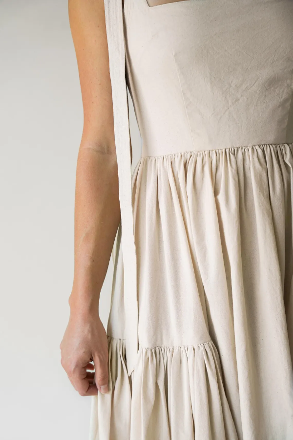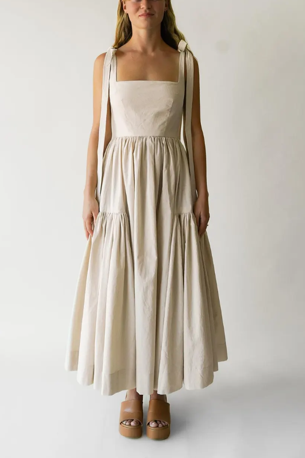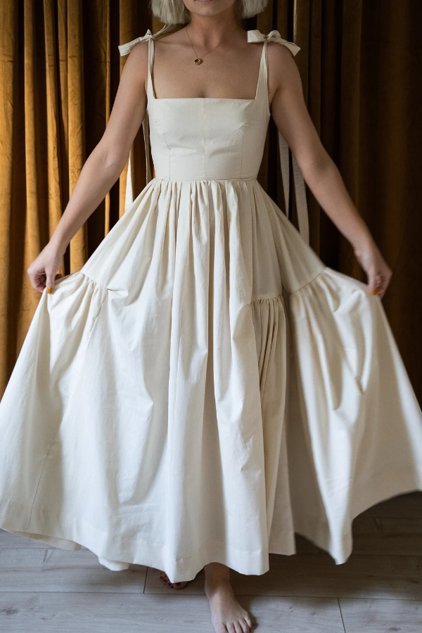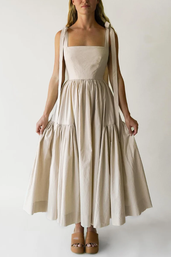 The fluffy, double-layered pleated skirt creates an airy feel when you move, retaining the elegance of vintage dresses while the relaxed fit reduces formality, making it perfect for everyday wear. The length is adjustable, allowing you to tie a bow for a sweet touch or adjust the tightness to suit different body types and shoulder shapes. The square neckline reveals the collarbone for a refined look, and the cinched waist naturally enhances the waist-to-hip ratio, offering some forgiveness around the midsection. The double-layered pleats add a sense of volume to the dress, but the lightweight fabric ensures comfort and unrestricted movement.