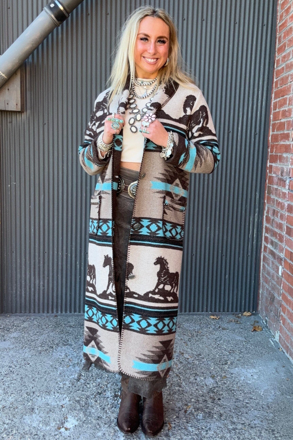This STROLLER is a wool blend generous fit unlined mid length (42" center back finished length) Stroller Coat. Shawl collar, 4 concho buttons, turn back sleeve, matching patch pockets & blanket-stitch finish.