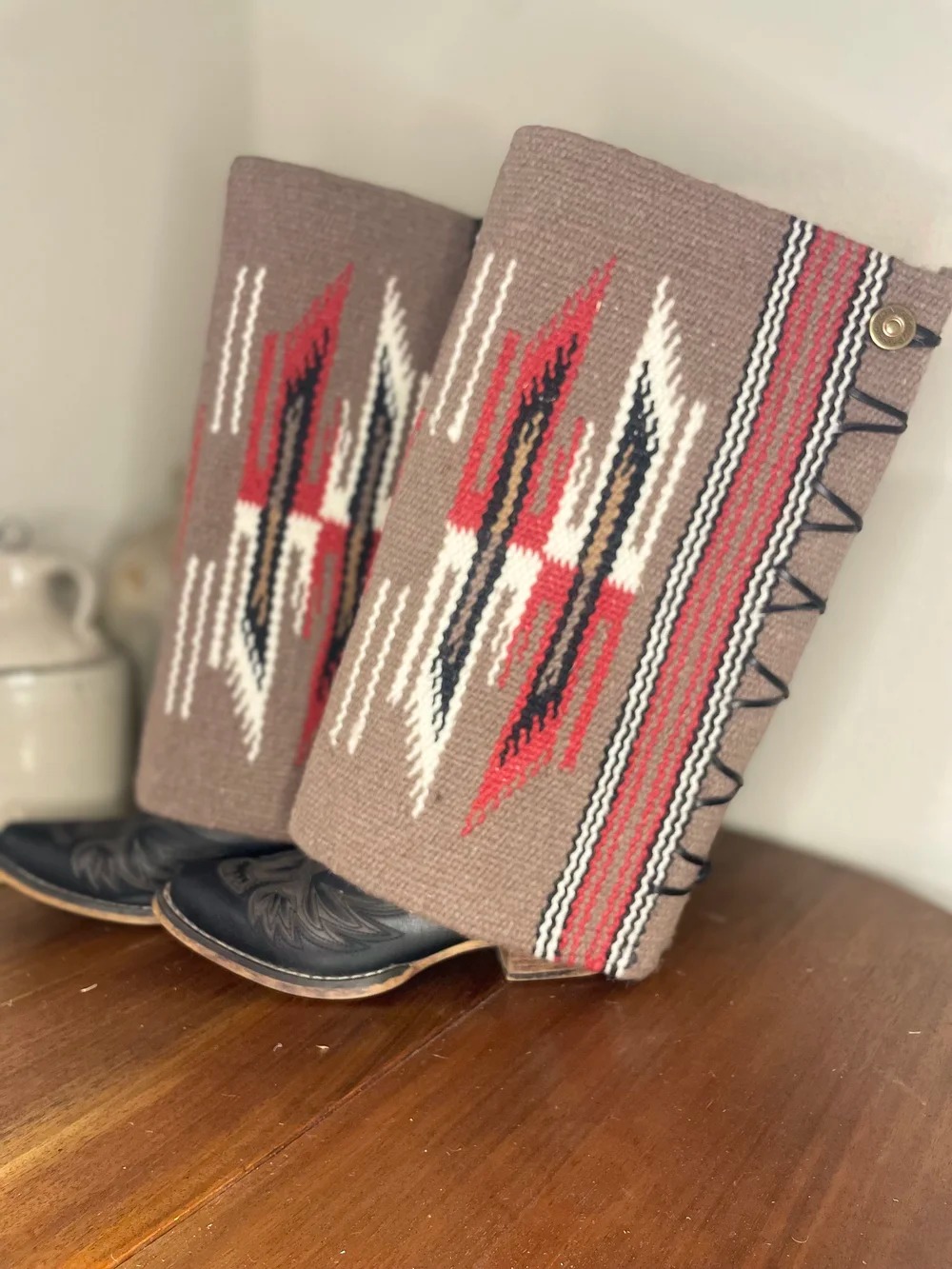 Embrace bold Western style with these Aztec print fringe boot cuffs, designed to transform any pair of boots into a statement piece.