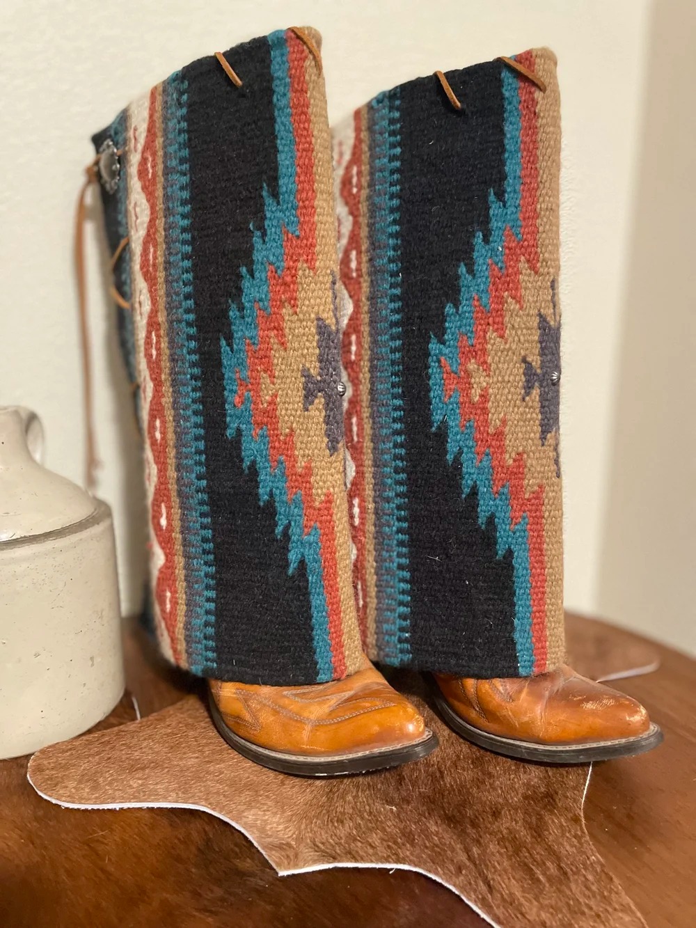 Embrace bold Western style with these Aztec print fringe boot cuffs, designed to transform any pair of boots into a statement piece.