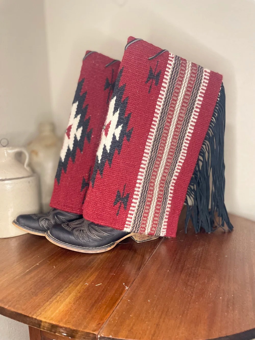 Embrace bold Western style with these Aztec print fringe boot cuffs, designed to transform any pair of boots into a statement piece. Crafted from soft, durable knit fabric, these boot covers feature a vibrant tribal pattern in rich burgundy and ivory tones, accented with playful fringe details that sway with every step.