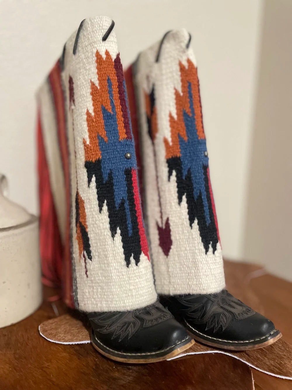 Embrace bold Western style with these Aztec print fringe boot cuffs, designed to transform any pair of boots into a statement piece. Crafted from soft, durable knit fabric, these boot covers feature a vibrant tribal pattern in rich burgundy and ivory tones, accented with playful fringe details that sway with every step.