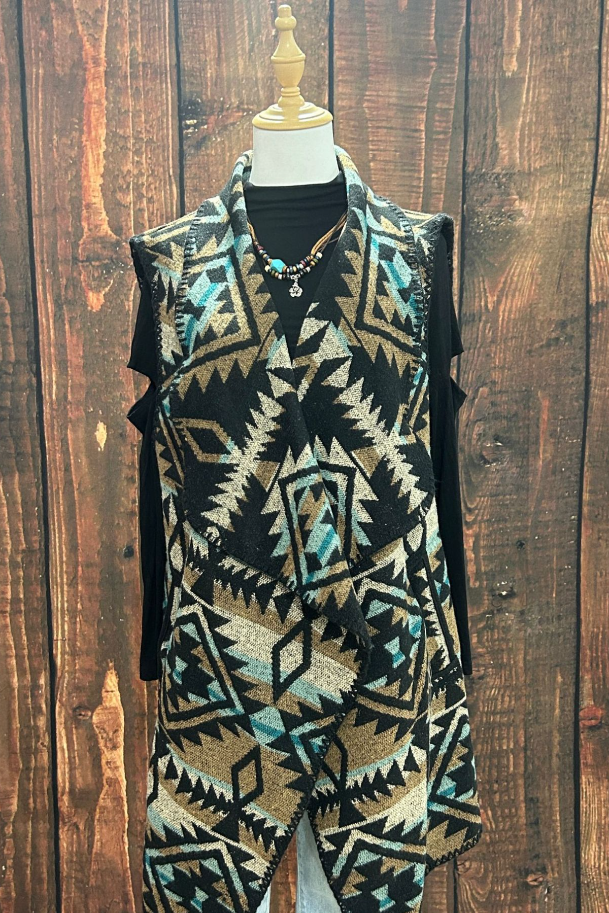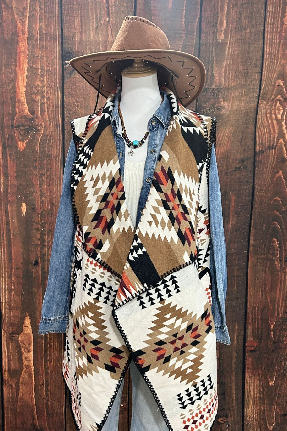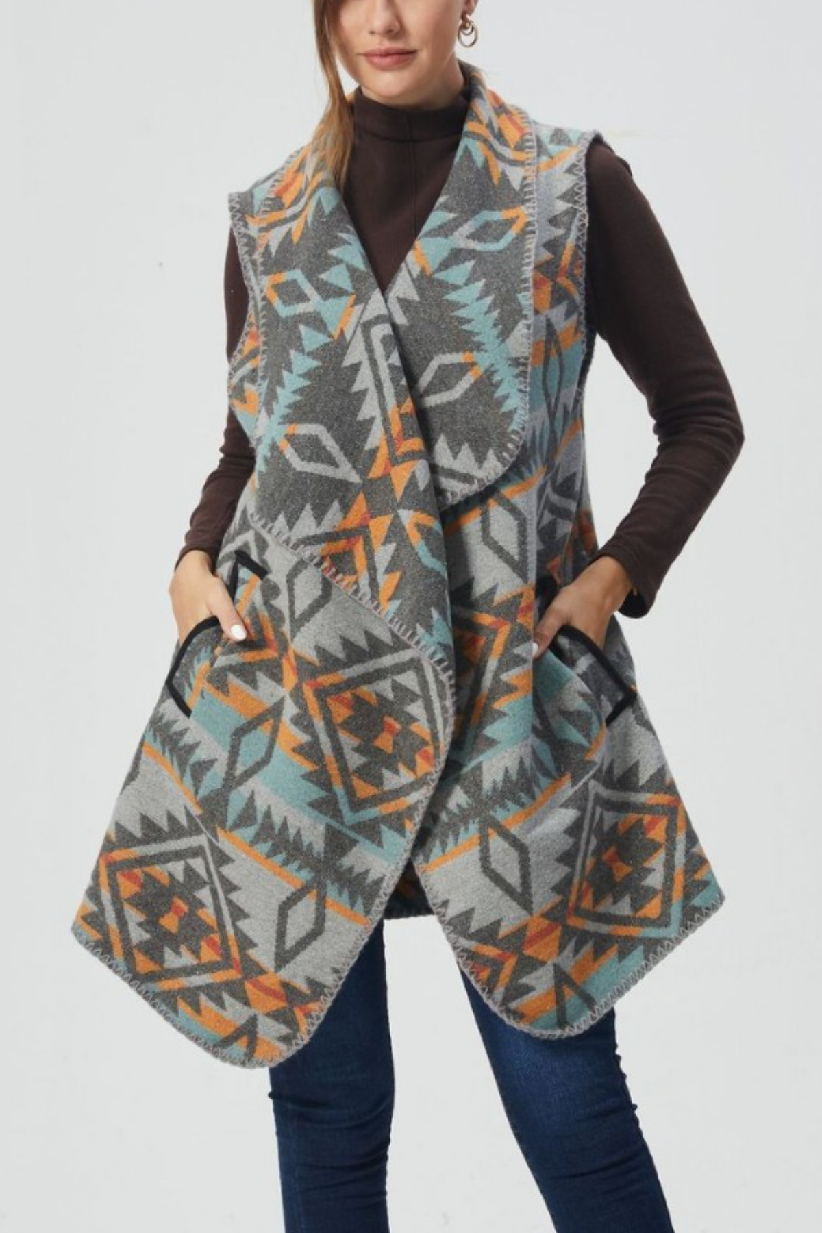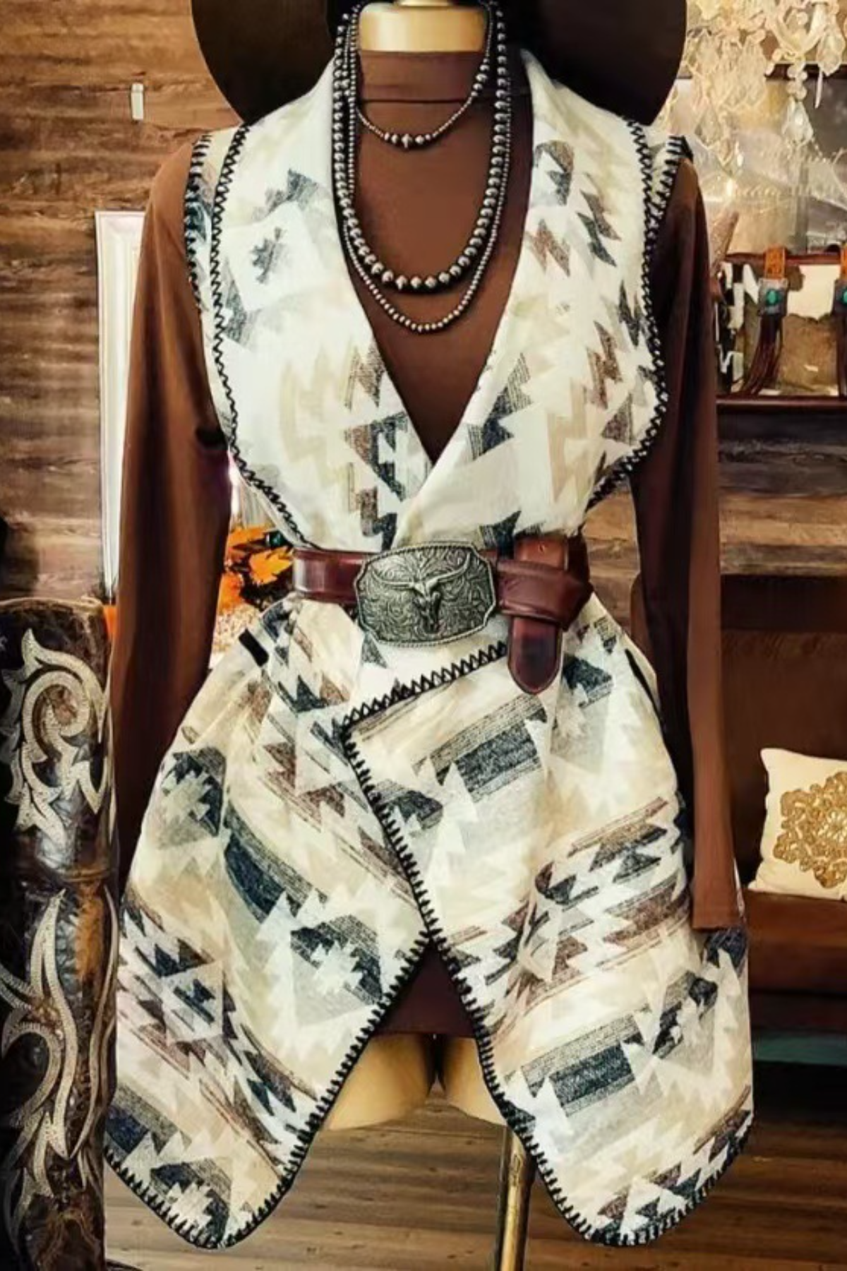 This vest features an ethnic geometric jacquard design, combining retro colors such as gray, orange, and blue to present a strong bohemian style. The sleeveless version with an irregular hem is casual and chic. It can be layered with a denim shirt and a knit inner top, making it rich in layers and versatile in style. Whether paired with jeans for a casual street look or with a dress for a romantic style, it can be easily managed, injecting a unique retro artistic sense into your outfit.