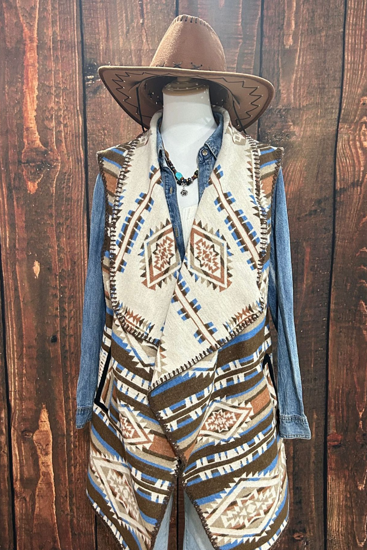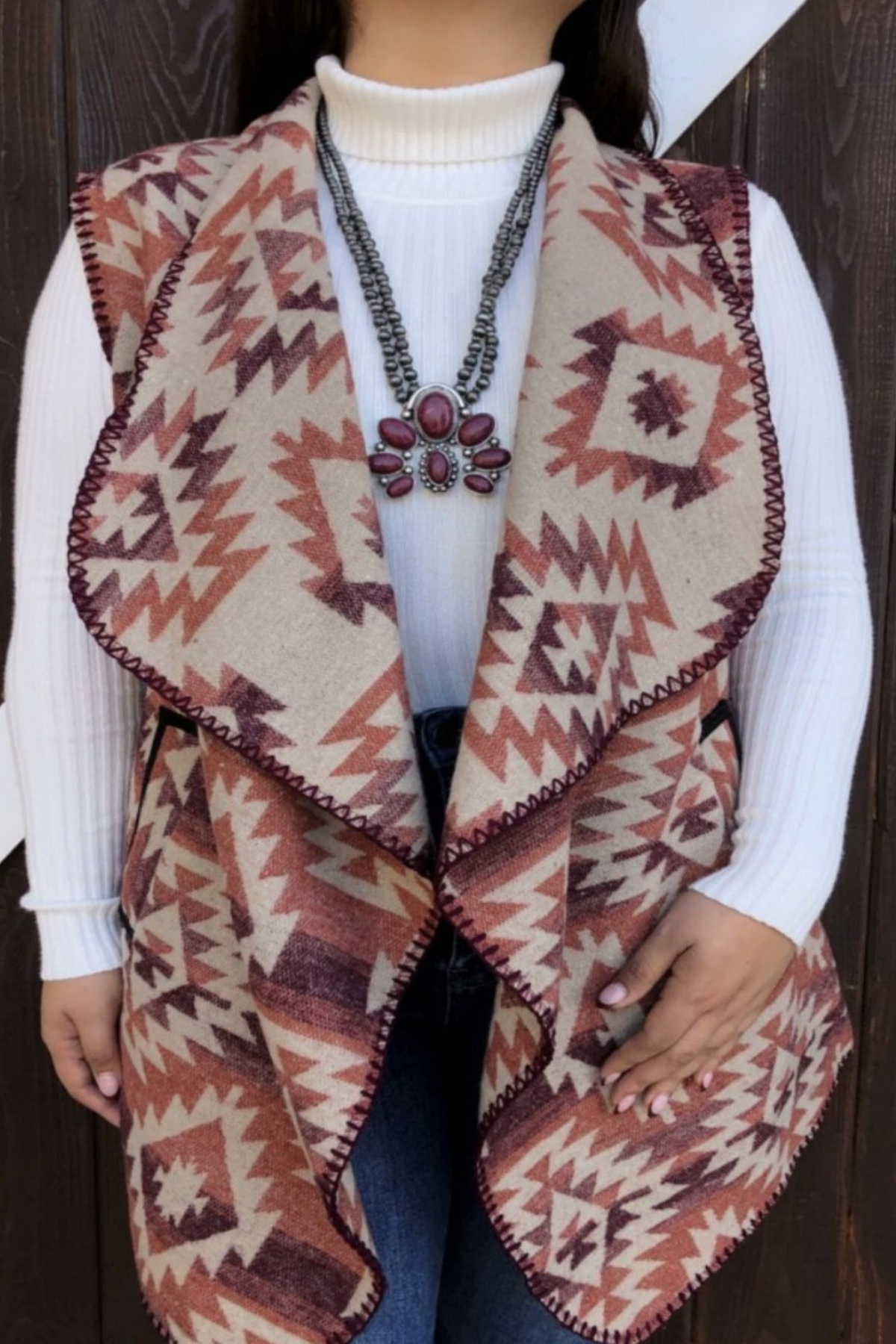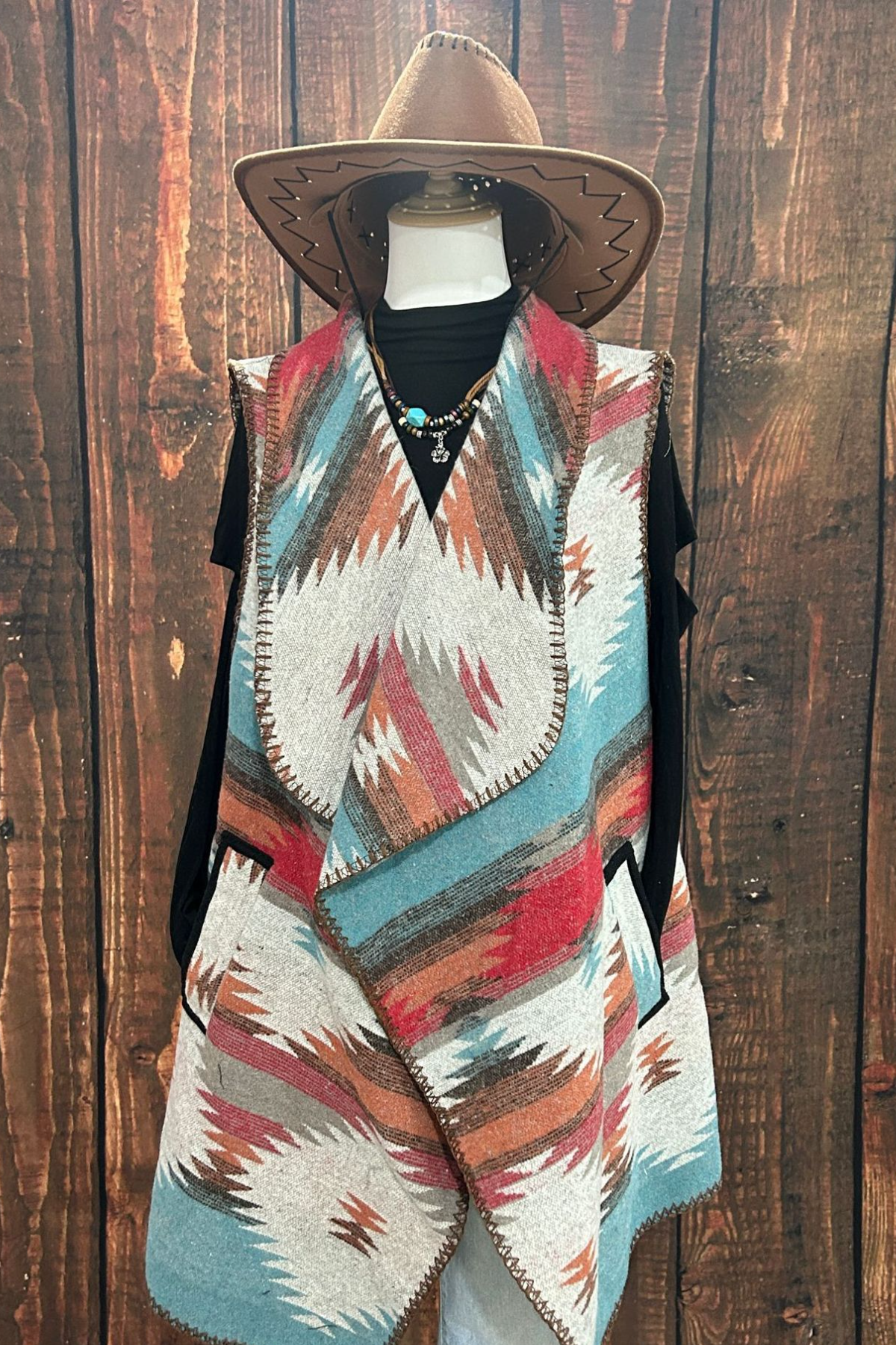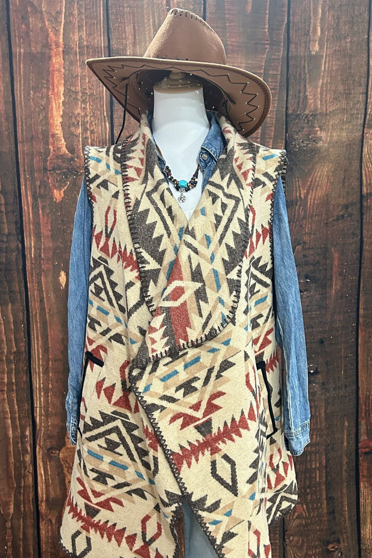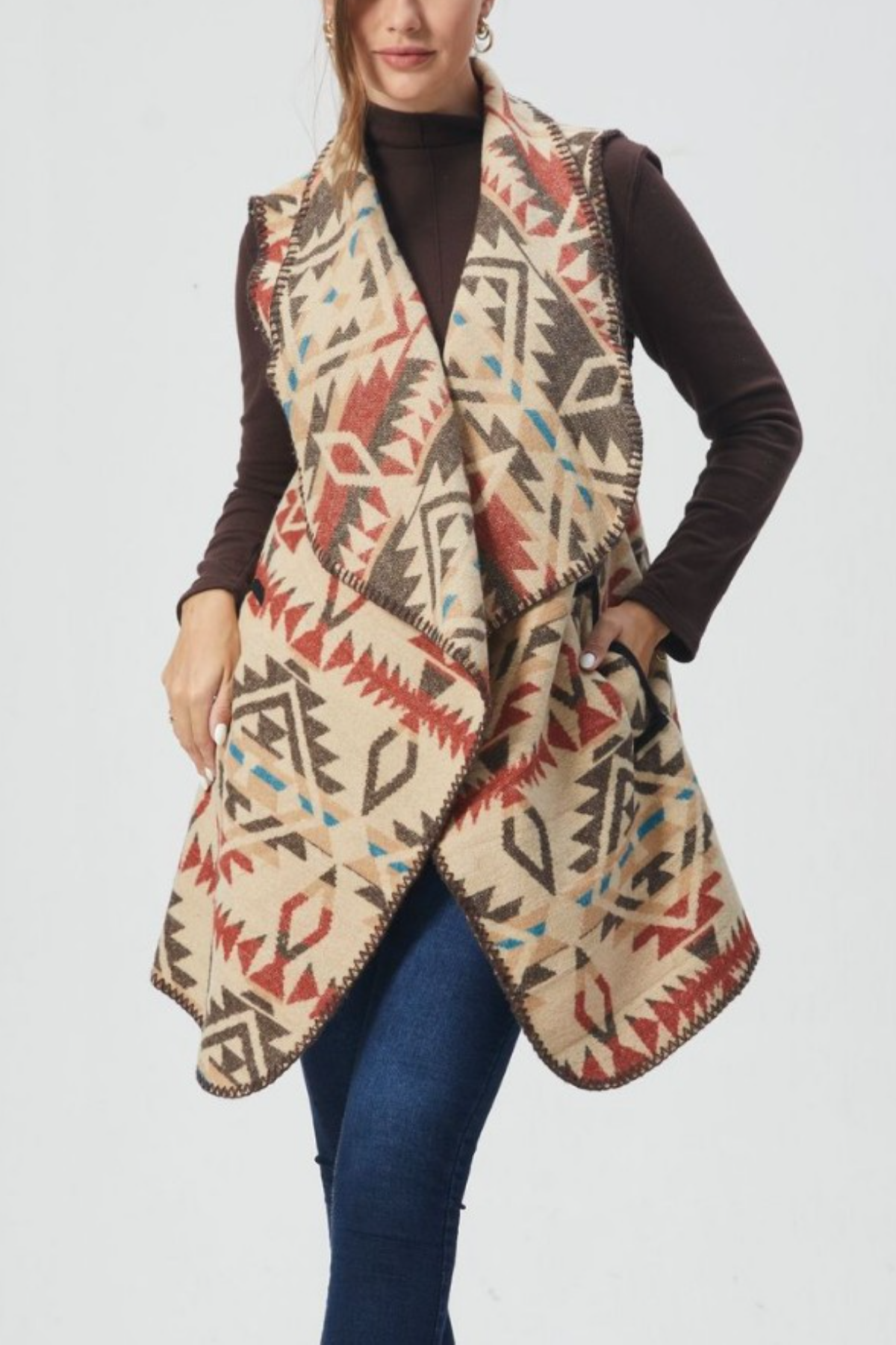 This vest features an ethnic geometric jacquard design, combining retro colors such as gray, orange, and blue to present a strong bohemian style. The sleeveless version with an irregular hem is casual and chic. It can be layered with a denim shirt and a knit inner top, making it rich in layers and versatile in style. Whether paired with jeans for a casual street look or with a dress for a romantic style, it can be easily managed, injecting a unique retro artistic sense into your outfit.